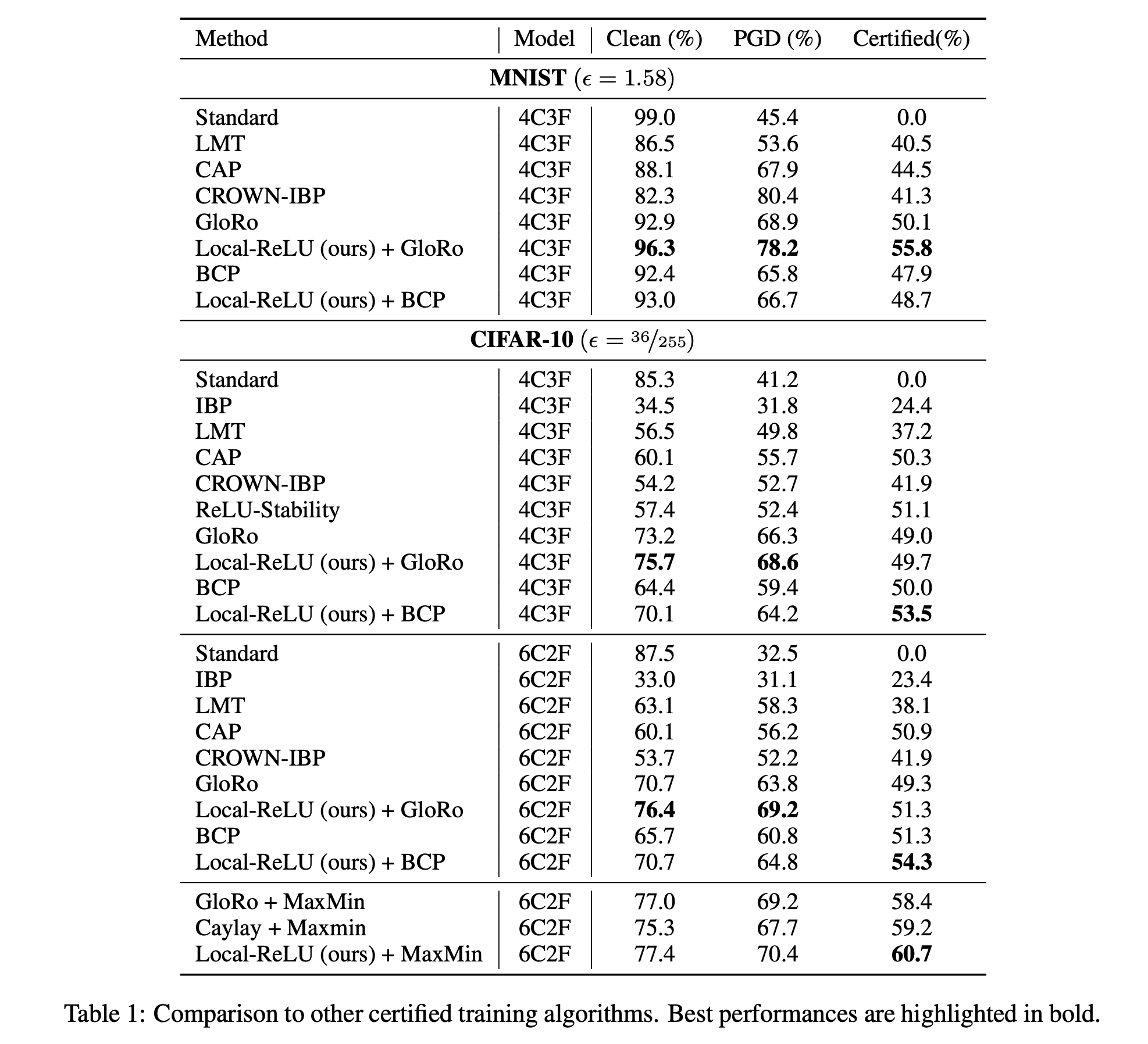 We included the comparisons with the latest baselines with the MaxMin activation functions, and other differentiable training. Our method outperforms the baselines for both ReLU and Maxmin activation functions.
